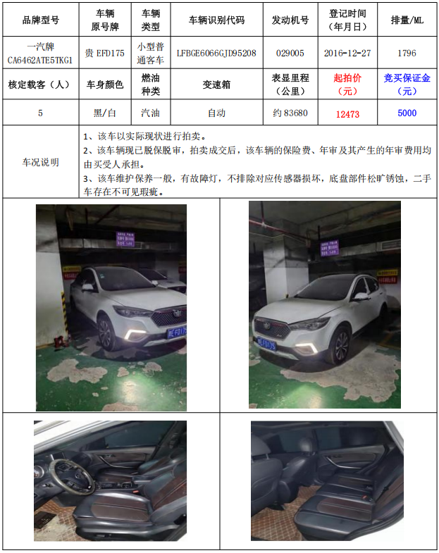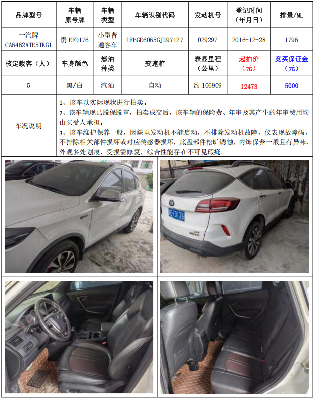 拍品編號5:一汽牌CA6462ATE5TKG1小型普通客車1輛(車輛原號牌:貴EFD176)