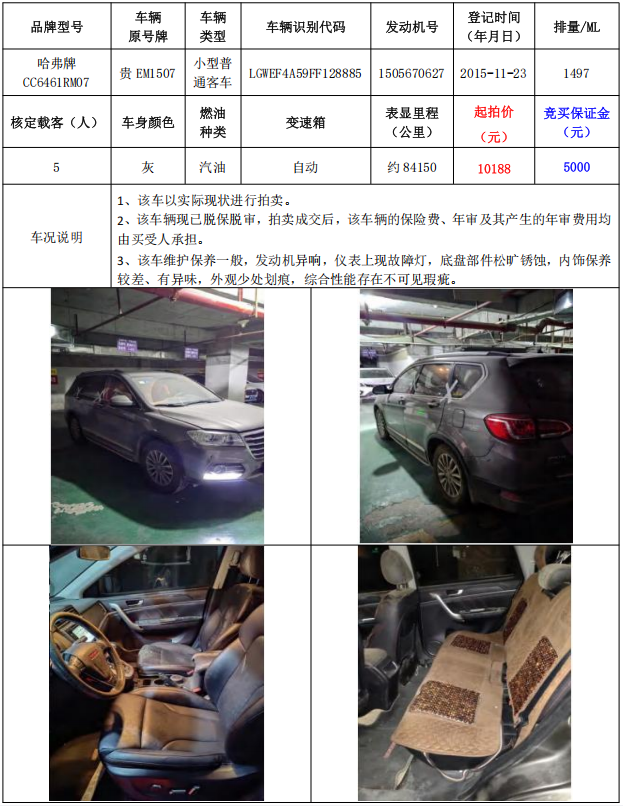 拍品編號6:哈弗牌CC6461RM07小型普通客車1輛(車輛原號牌:貴EM1507)