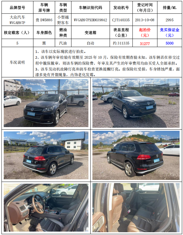 拍品編號1:大眾汽車WVGAB97P小型越野客車1輛(車輛原號牌:貴DW5886)