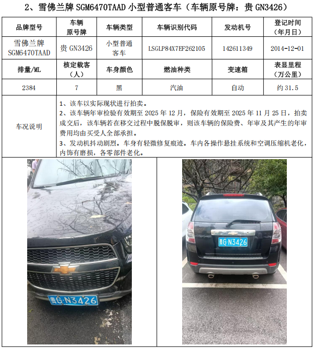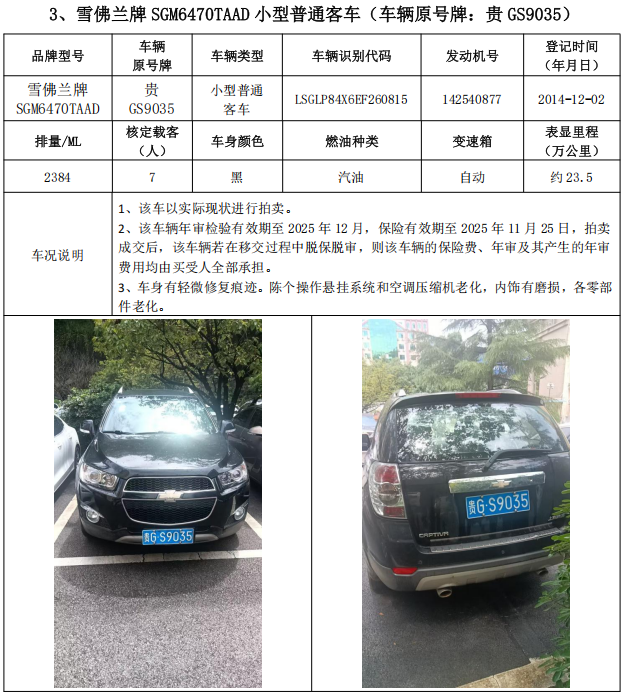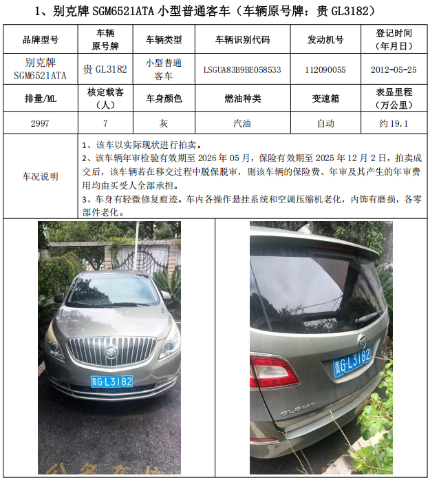 3、別克牌SGM6521ATA小型普通客車1輛、雪佛蘭牌SGM6470TAAD小型普通客車2輛,共計3輛,整體拍賣,起拍價:28600元,競買保證金:5000元。